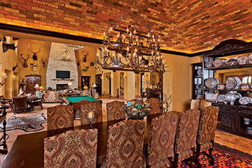 It was in every way, Ramsey says, a once-in-a-lifetime professional and personal experience. “My favorite part of this project was the glow on John and Betty’s faces upon the completion of the hacienda,” she says. “They became not only satisfied clients, but friends for life. It was very challenging but so rewarding.” Helping her and the Martins embrace the home’s challenges was Kendrick, who has been in the design business for more than 40 years. Despite her long career, Kendrick admits to being speechless when she first viewed the ranch’s blueprints and renderings. “The central courtyard had a bell tower over the front entrance gate — a real one,” she says. “The main house had an observation tower that overlooked the dammed-up river and a picturesque view of heaven on earth. There was a magnificent outdoor kitchen off of an enormous porch. This home was to have all the bells and whistles, with unimaginable details, while sparing no expense.”