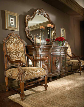 The look and feel of Old World Spain have been beautifully captured in this grand collection, designed exclusively for the Michael Amini Original Furniture Designs. Beautifully crafted from Birch solids with Cherry, Pecan, and Elm Burl veneers, the distinctive marquetry and intricate embellishments compliment a classic chestnut finish. Uniquely twisted and shaped marble pilasters with carved wooden leaves wrapping around adorn some of the pieces.